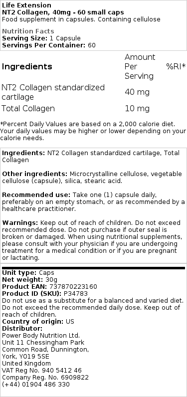 Life Extension – NT2 Collagen on ravintolisä, joka on suunniteltu tukemaan yleistä hyvinvointiasi ja liikkuvuuttasi. Tämä tuote sisältää 40 mg undenaturoimatonta tyyppi II kollageenia per kapseli, mikä auttaa ylläpitämään nivelten mukavuutta ja joustavuutta.